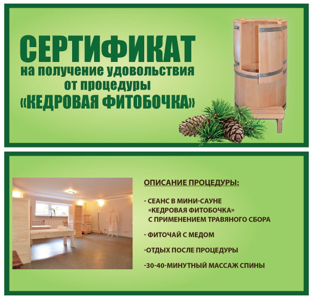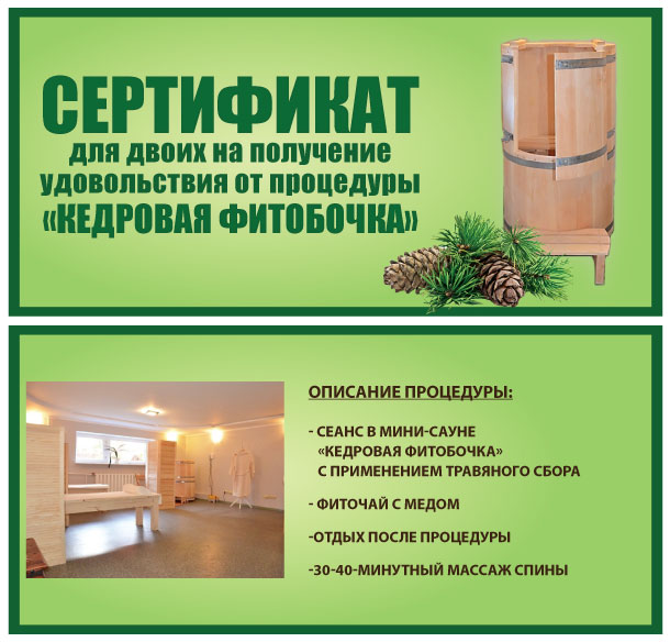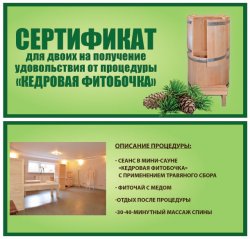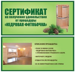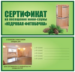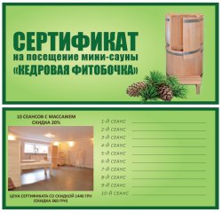 У нас новинка: подарочные и скидочные сертификаты на посещение фитосауны. Подарочные сертификаты на одного или двух человек - отличный подарок вашим друзьям и близким.